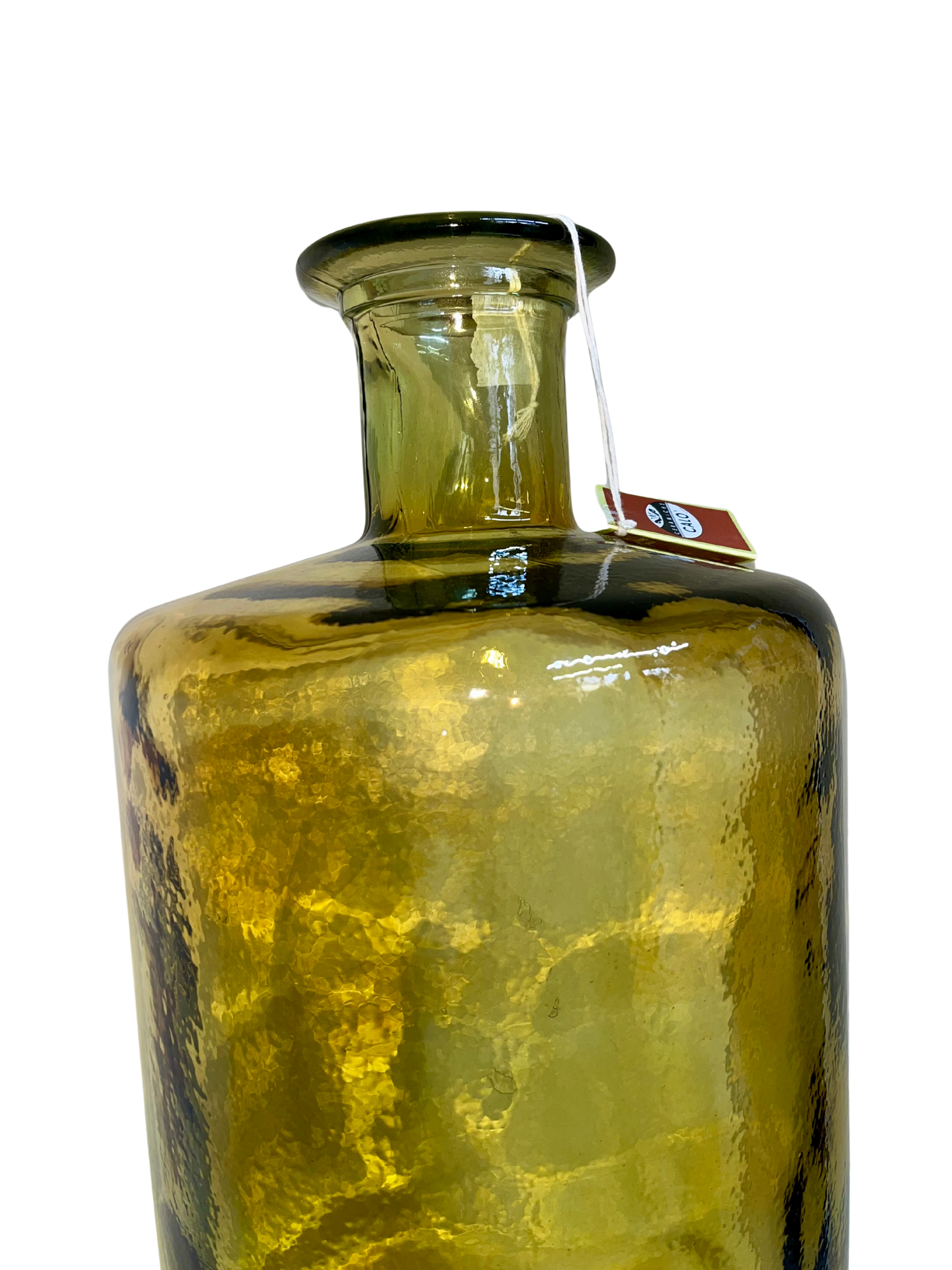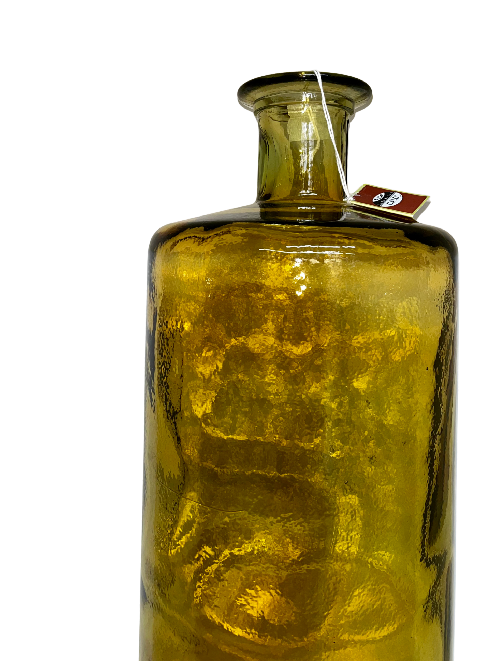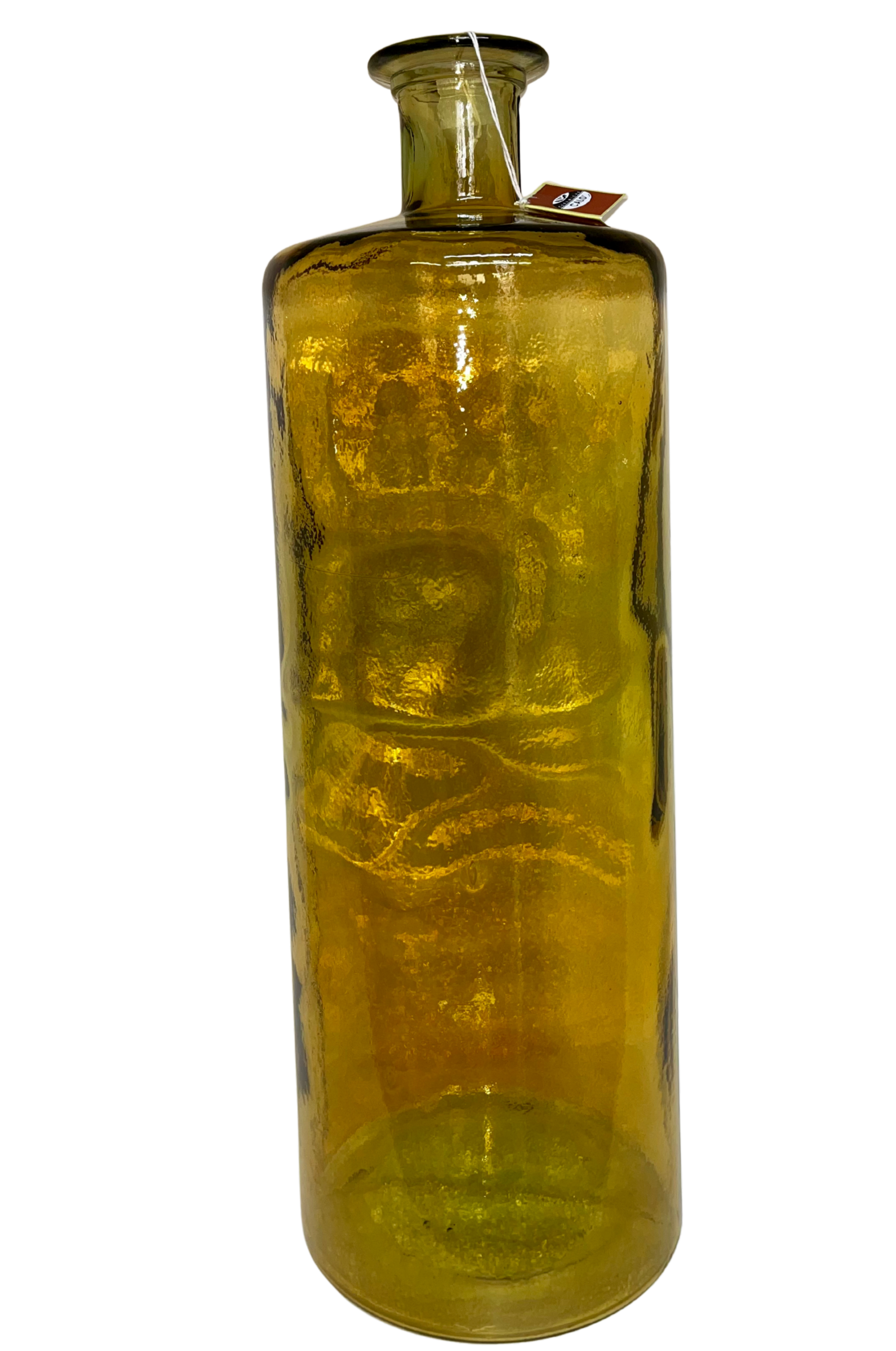 Bottiglione decorativo in vetro organico riciclato di colore ambra. Ideale come soprammobile per interni, utilizzabile anche come vaso. La finitura trasparente rende la bottiglia utilizzabile sia come vaso sia come decorazione. Dimensione: H75cm x Ø25cm.