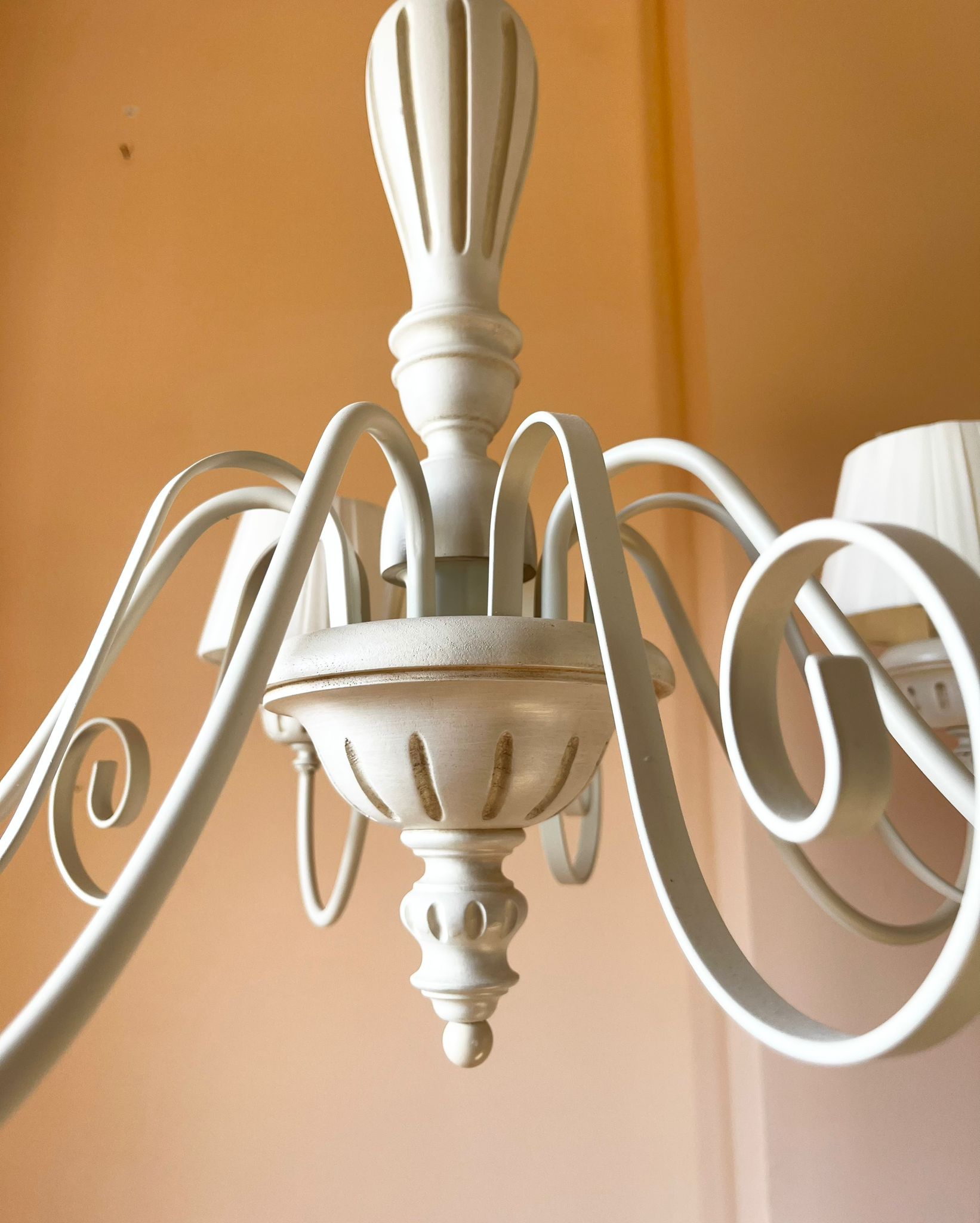 Dotato di braccia con paralumi italiani completamente lavabili, unisce estetica e praticità, garantendo facilità di manutenzione senza rinunciare al gusto. La finitura in tonalità avorio con leggere sfumature decapate esalta il pregio della lavorazione artigianale, rendendolo perfetto per soggiorni, sale da pranzo o camere da letto dallo stile classico o shabby chic.