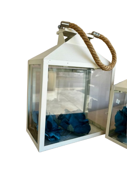 Questa sofisticata lanterna in metallo color crema è disponibile in due dimensioni: 31 cm di altezza e 12 cm di larghezza, oppure 23 cm di altezza e 9 cm di larghezza. Perfetta per creare un'atmosfera accogliente e confortevole, la sua robusta struttura in metallo garantisce prestazioni di lunga durata. Fiori blu all'intero non inclusi.