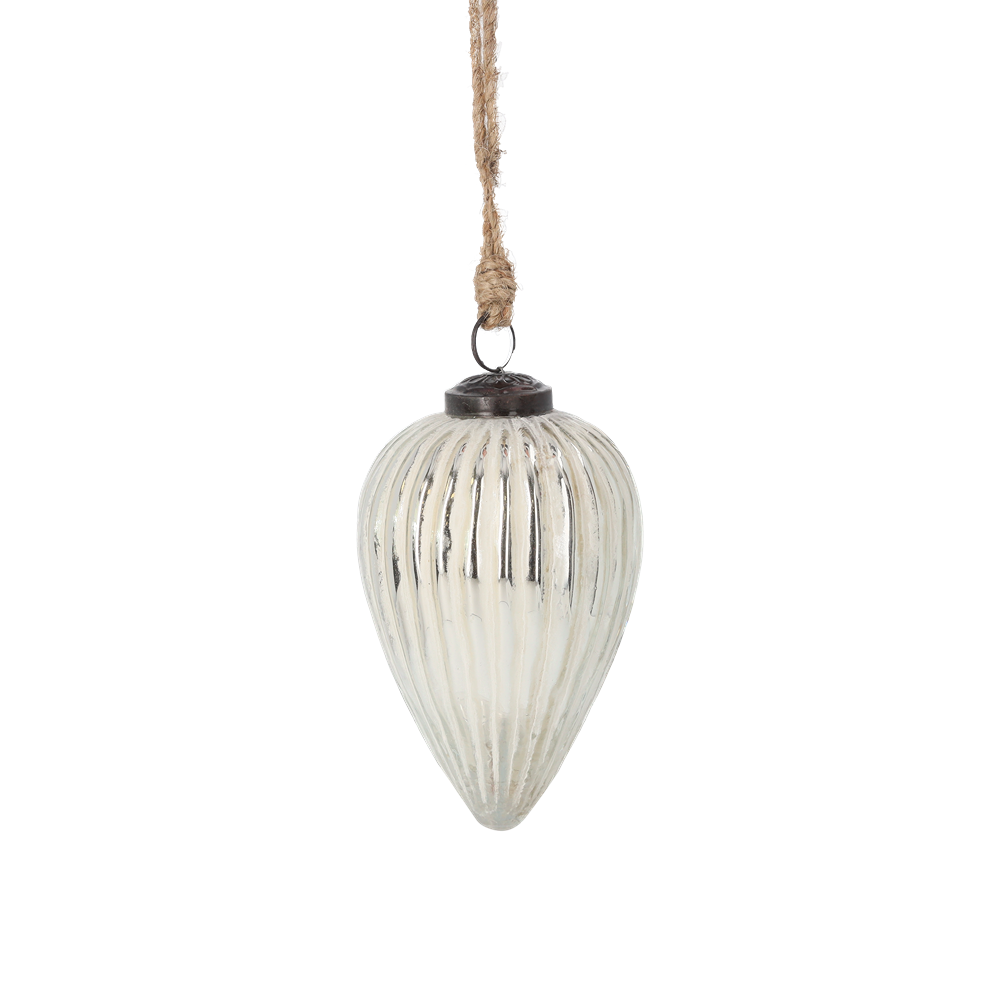 Goccia decorativa natalizia in vetro di colore bianco con decorazioni argentate, misura piccola. Da appendere grazie allo spago in corda grezza legato alla parte superiore. Ideale come decorazione natalizia da appendere oppure da utilizzare come decorazione che accompagna l'albero di Natale. Dimensione: H14cm x Ø9cm.