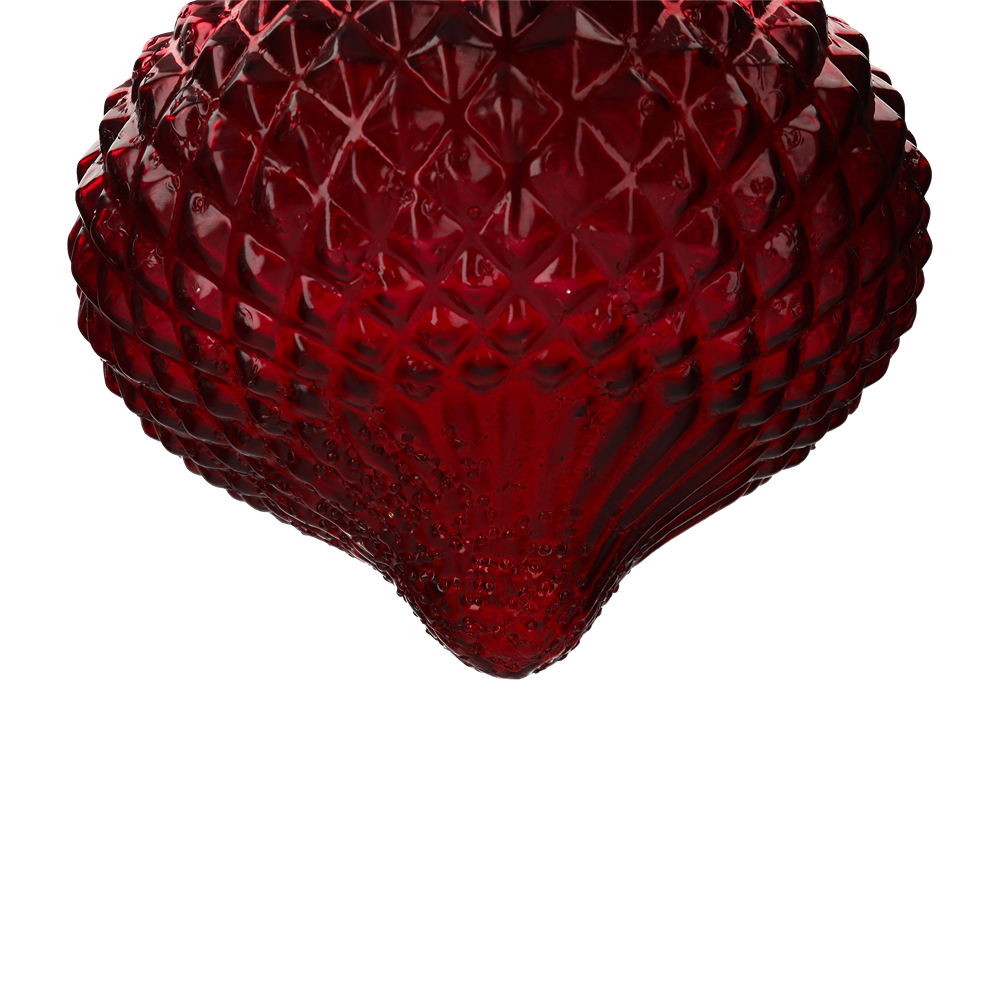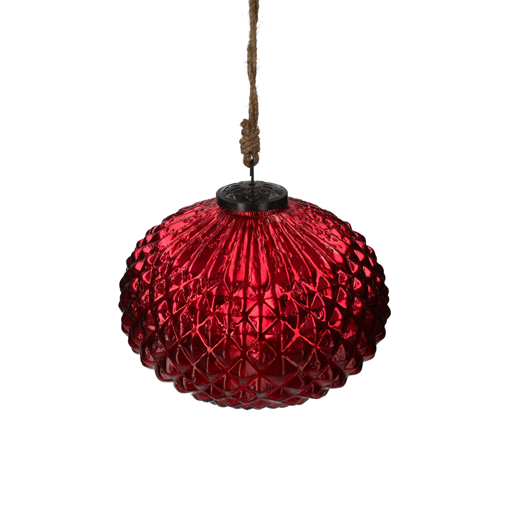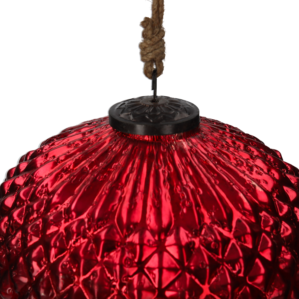 Trottola decorativa natalizia in vetro di colore rosso, misura grande. Da appendere grazie allo spago in corda grezza legato alla parte superiore. Ideale come decorazione natalizia da appendere oppure da utilizzare come decorazione che accompagna l'albero di Natale.