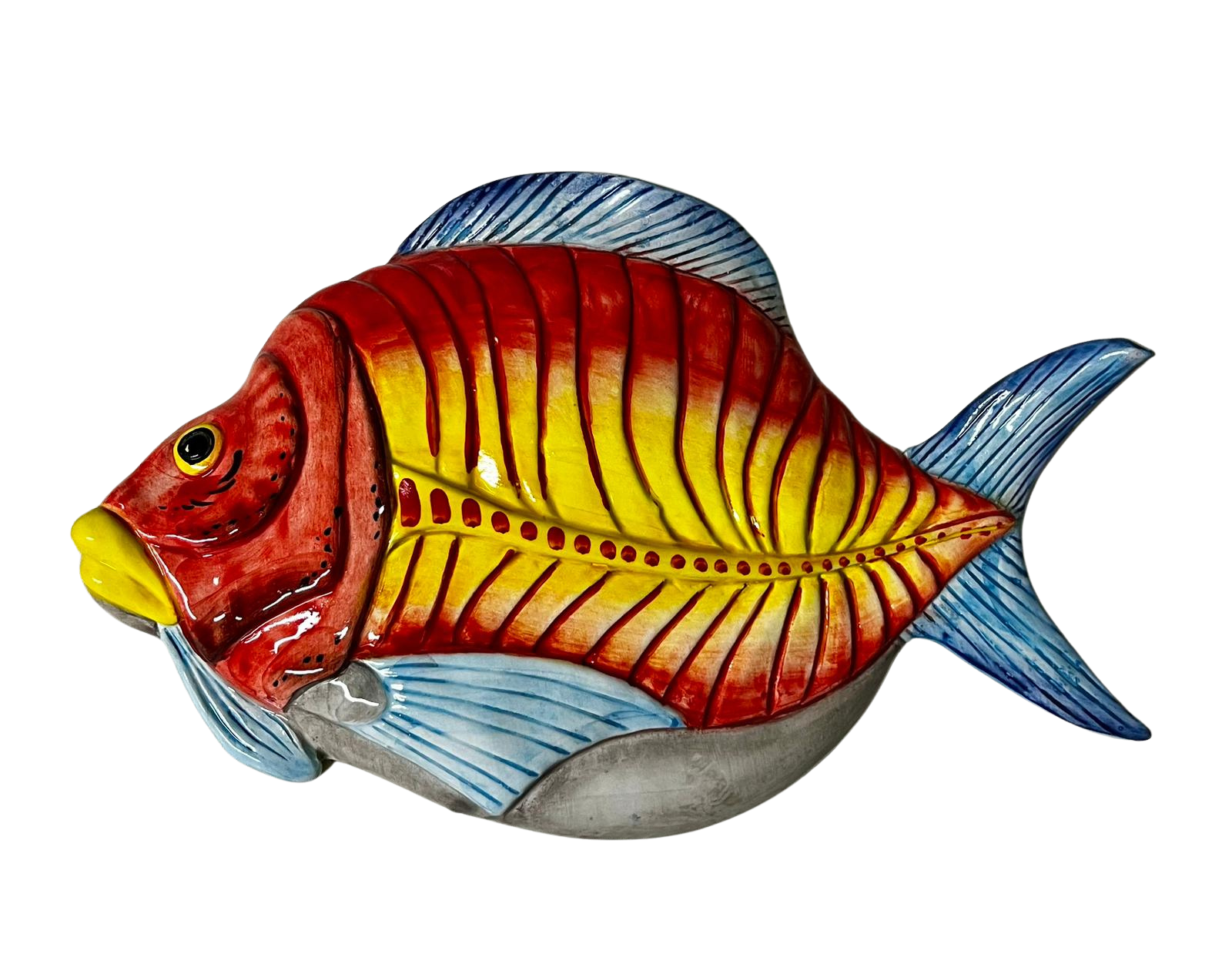 Questa decorazione in ceramica di Pesce Spina, realizzata a mano in Italia, darà un tocco unico alla tua casa. Disponibile in tre vivaci colorazioni (rosso, verde, blu), le dimensioni di 34x20x3cm la rendono perfetta da appendere ovunque. Aggiungi un elemento di eleganza alla tua casa con Pesce Spina.