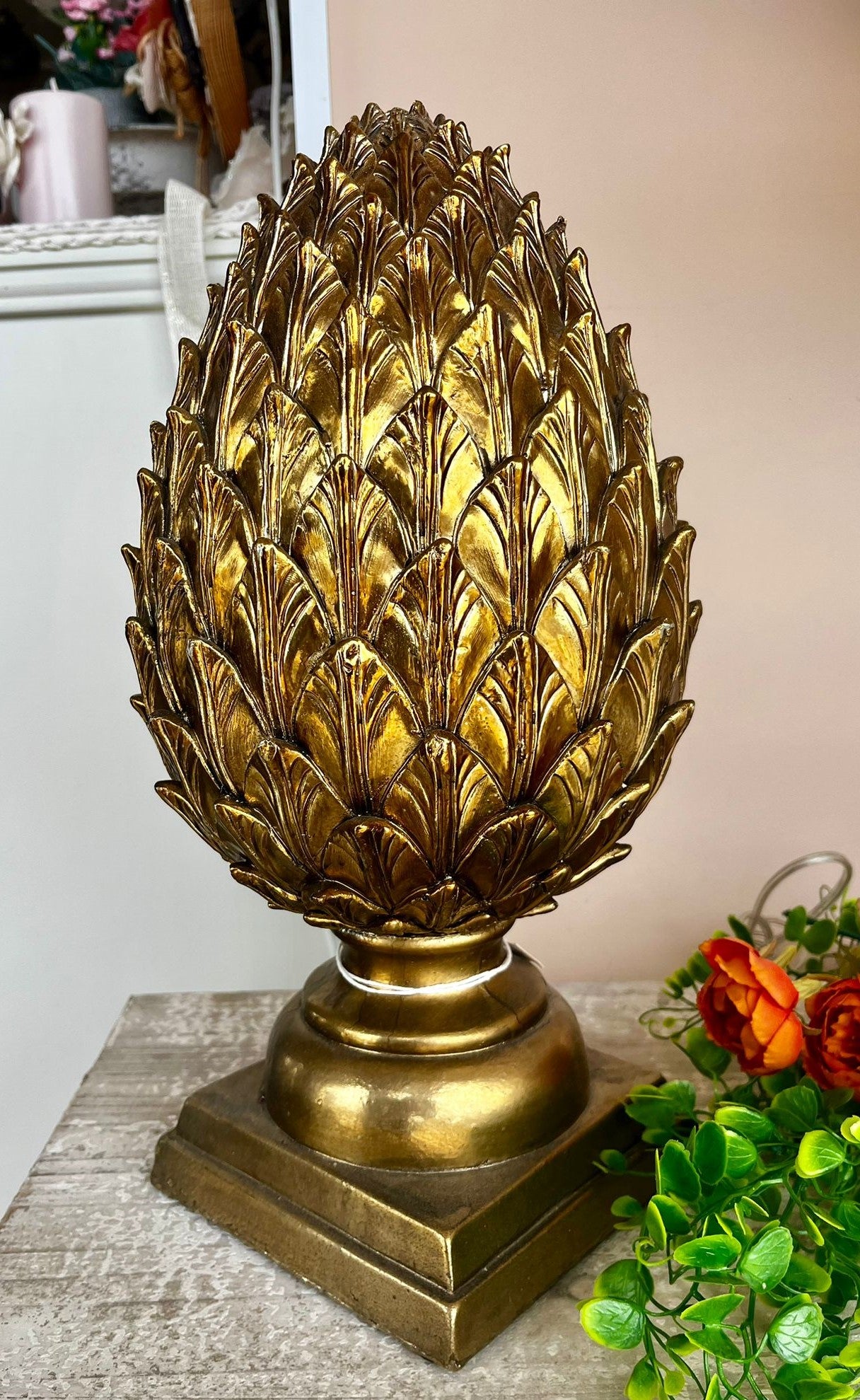Pigna in resina color oro patinato. Dimensioni: 40hx22Øcm.