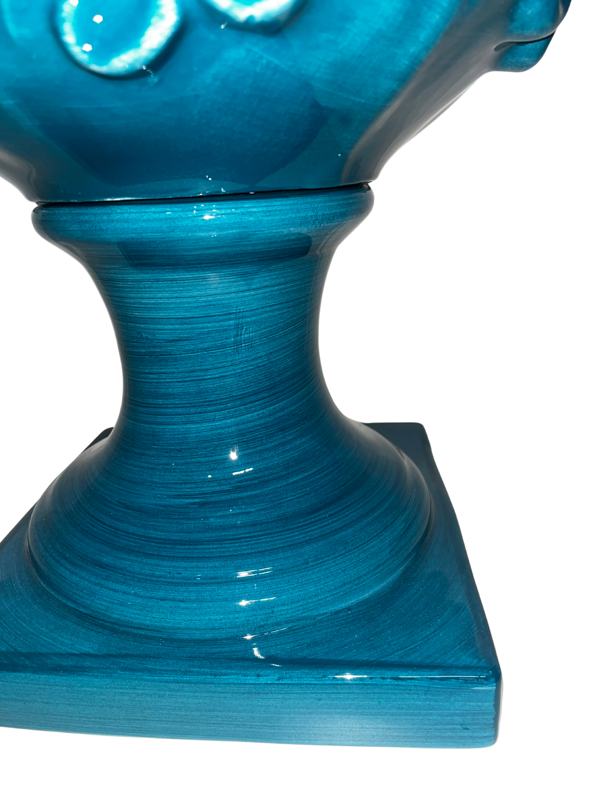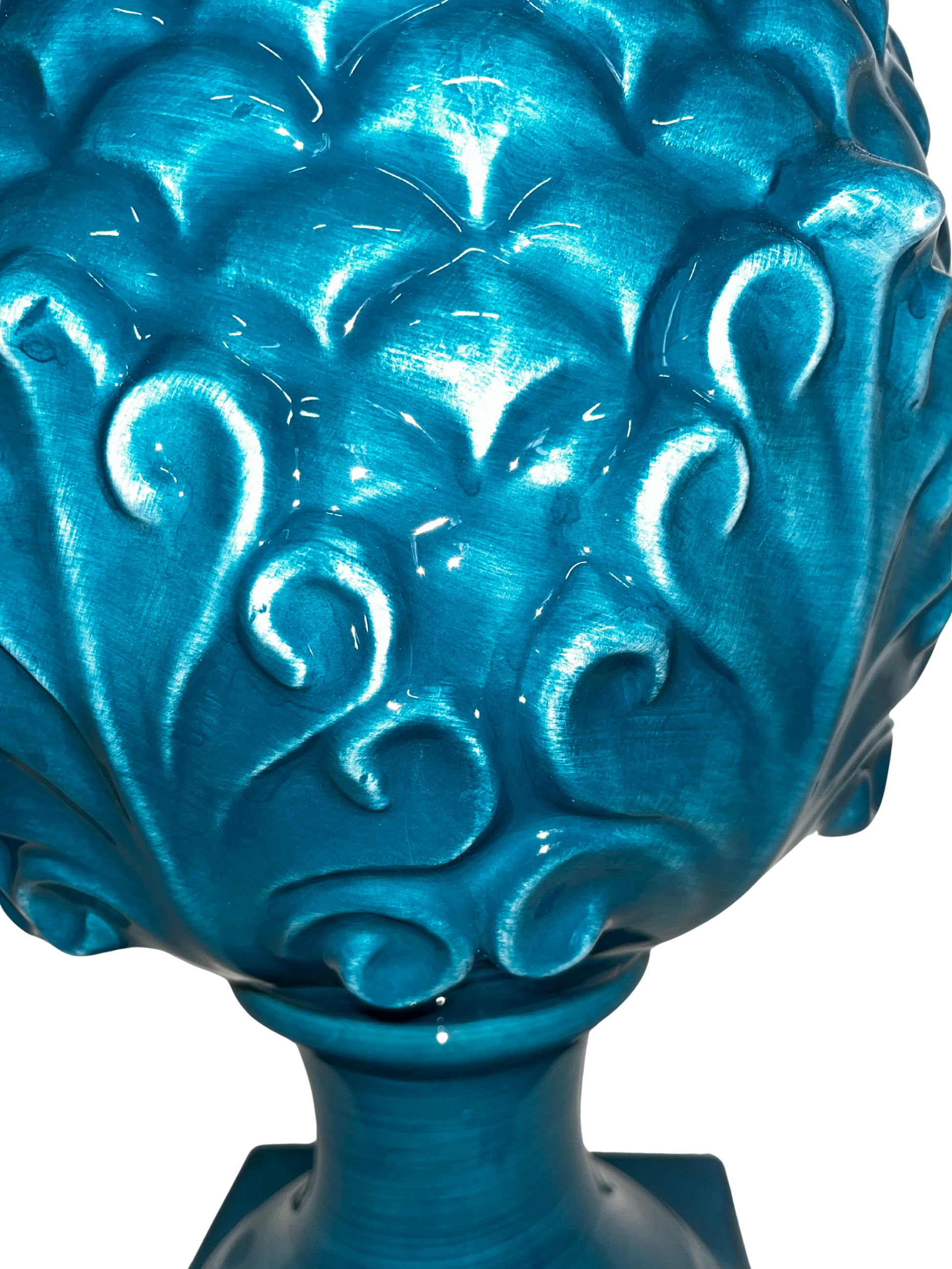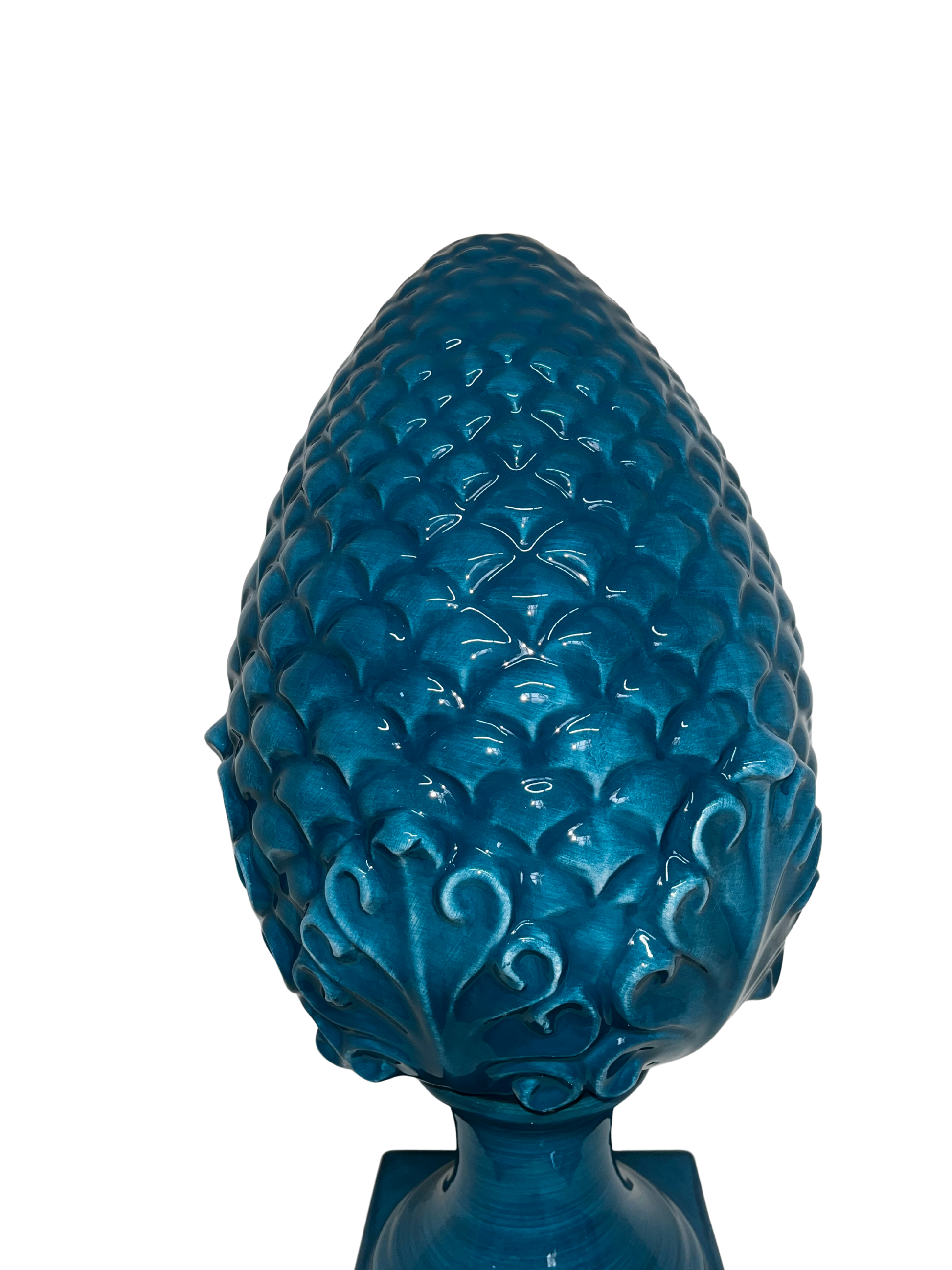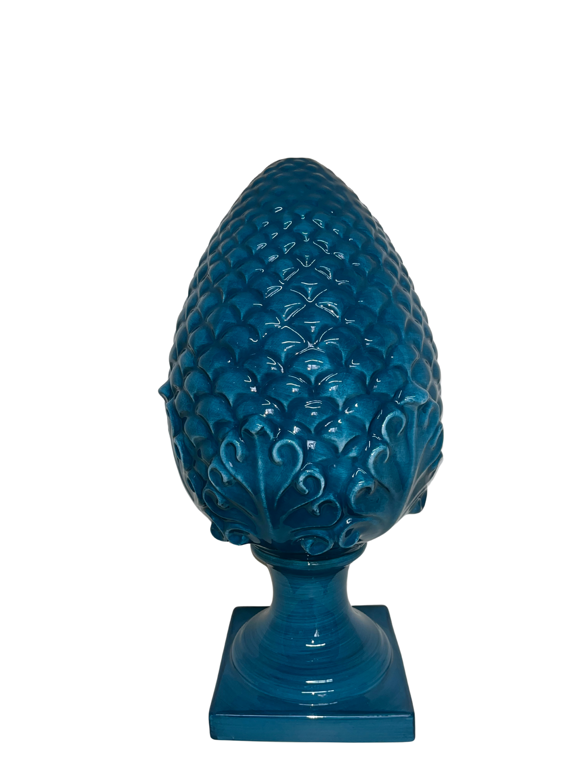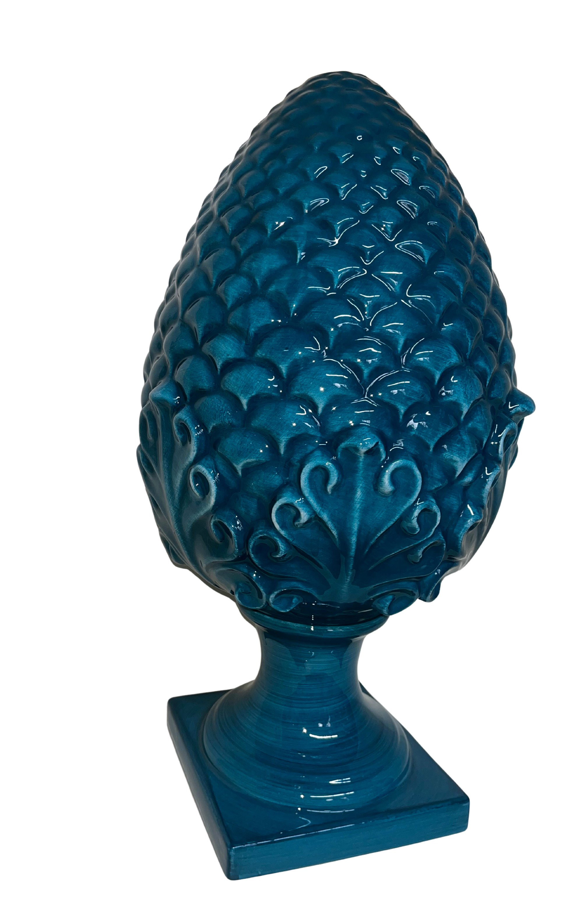Questa pigna decorativa in ceramica, si distingue per i dettagli in rilievo color blu petrolio che ne esaltano la raffinata lavorazione artigianale. Interamente realizzata a mano in Italia, rappresenta un oggetto d’arte funzionale per arricchire con eleganza qualsiasi ambiente, unendo tradizione e design di alta qualità. Dimensione: H60cm x Ø30cm.