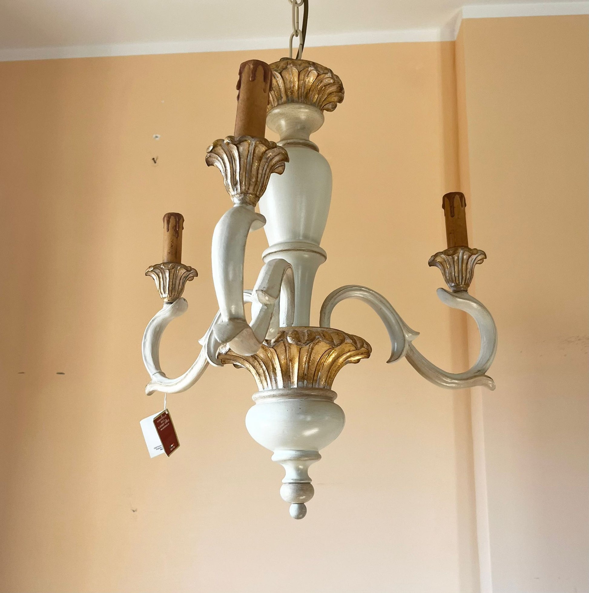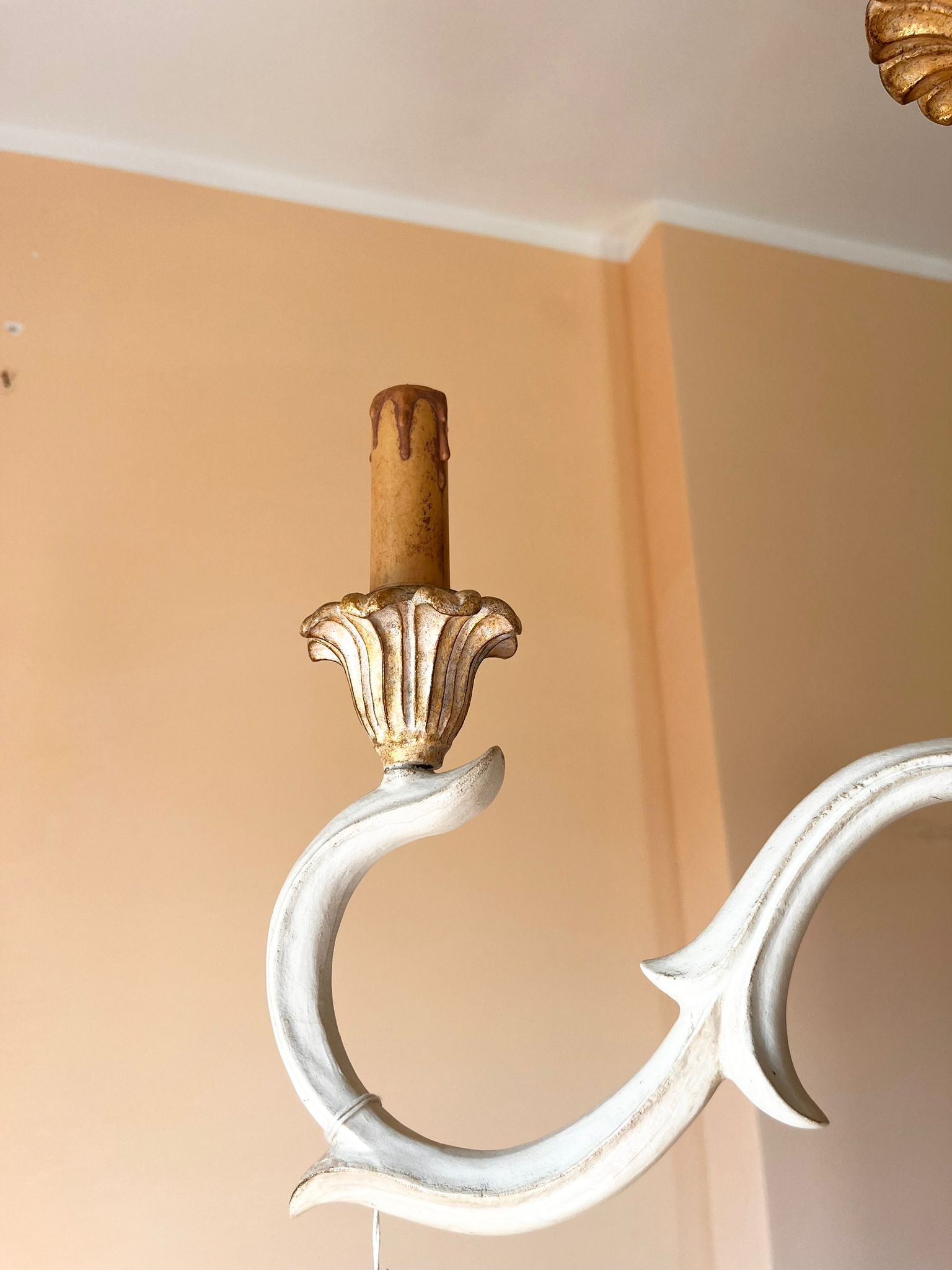 Eleganza senza tempo e maestria artigianale si fondono in questo lampadario in legno interamente realizzato in Italia. Le sue forme floreali scolpite richiamano lo stile barocco, reinterpretato con delicatezza in una finitura avorio patinata che ne esalta le curve armoniose. Le sei braccia sinuose accolgono portalampade a forma di candela, per un effetto luminoso caldo e avvolgente. Ideale per ambienti raffinati, saloni, sale da pranzo o ingressi importanti, questo lampadario è un omaggio alla tradizione decorativa italiana.