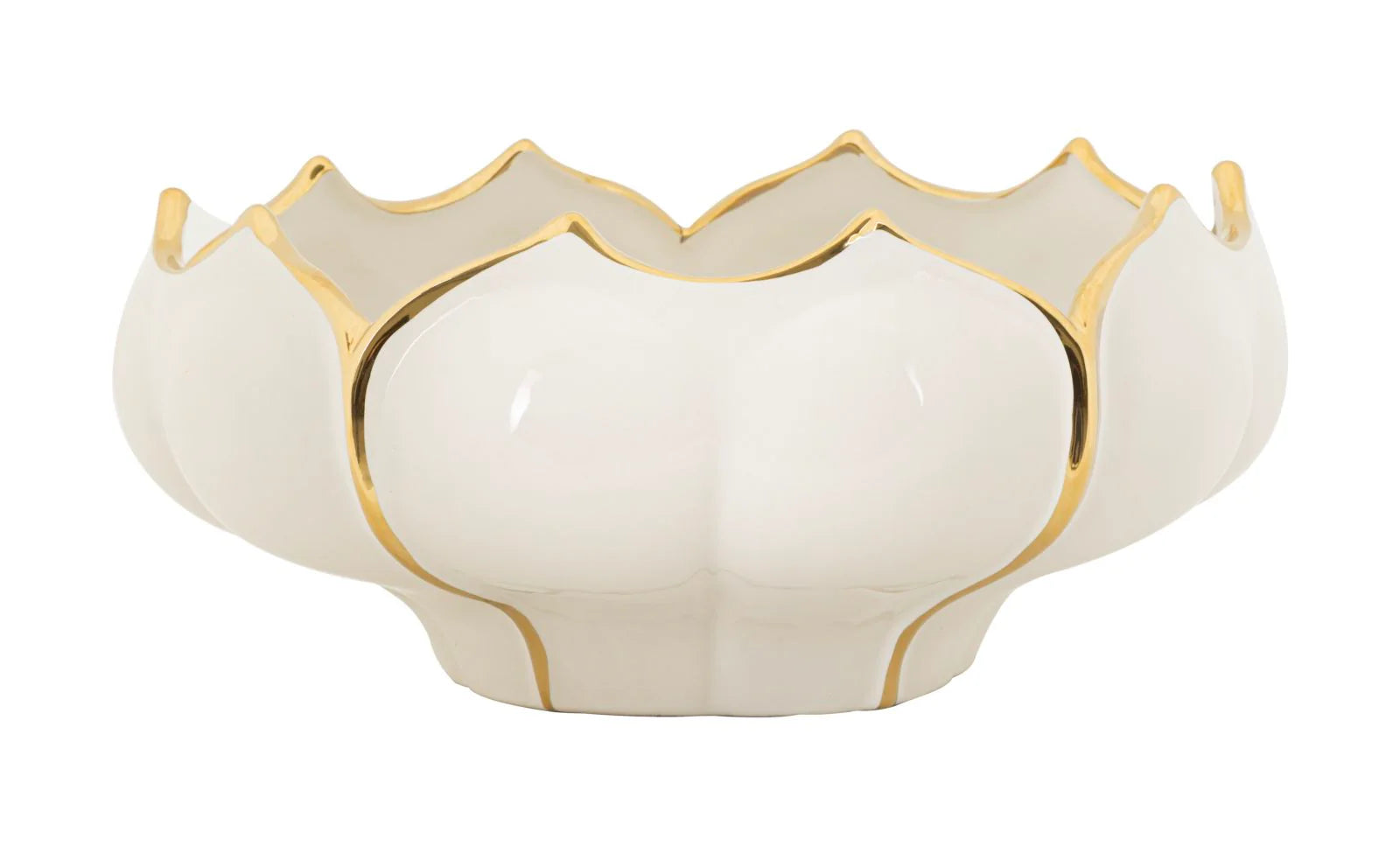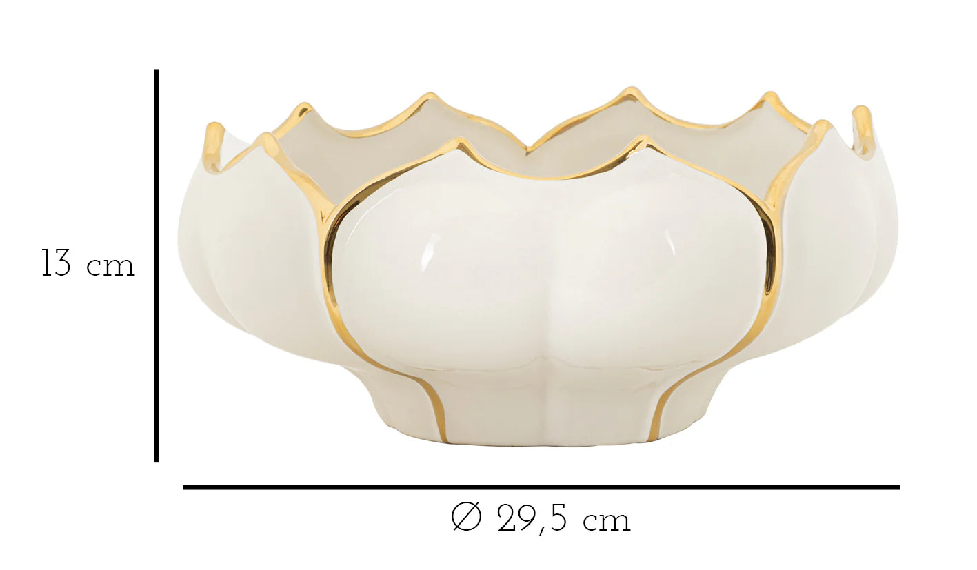 Svuota tasche in ceramica bianca con bordo oro lucido. Dimensione Ø29.5x13cm.